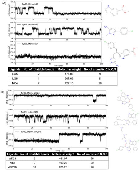 We are interested in the promising anticancer target Mdmx. Mdmx has two transient states, i.e., the open and closed states of Tyr99 χ1. The open state yields an enlarged pocket and provides a transient subpocket. In our previous work [69], we designed a series of Mdmx inhibitors and used MD simulations to study them and known Mdmx inhibitors. Dynamic changes in χ1 in Mdmx complexes show differences in the binding properties of Mdmx ligands. As seen from Figure 4, the increase in the number of rotatable bonds, molecular weight (MW), and aromatic atoms increased the probability of the ligands binding to the open state of Mdmx during the simulation time. Indeed, ligands LG5 and LG6 only partially bonded the Mdmx open state, while NC4, which combined both ligands and thus had increased rotatable bonds and MW as well as aromatic atoms, did so continuously (Figure 4A). Figure 4B shows three ligands with a common core structure consisting of single phenyl, indole, and pyrazole rings. Compared to WK23 and NT3, WK298 had more rotatable bonds and greater MW. The addition of the tertiary amine substructure also promoted the inducing property of WK298 [53], while WK23 [53] and NT3 were both non-inducers. Changes in the inducing propensity of ligands are thus consistent with the analysis of the descriptors and functional groups described in Section 3.3.