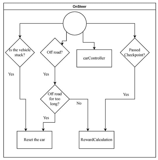 Interaction when given a steering command. The container is the function used, namely onSteer. The rectangles represent actions, e.g., resetting the vehicle or steering the vehicle. The rhombuses represent if statements, e.g., if the vehicle passed a checkpoint, give it a reward.