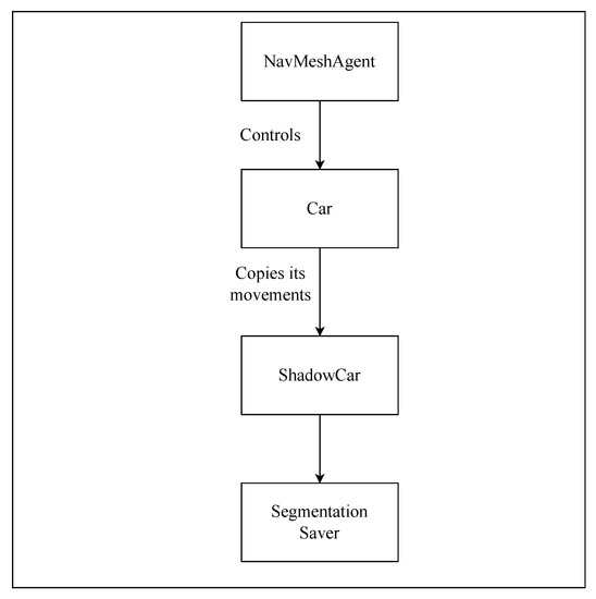 A group of cameras is added to the RGB and segmented vehicles for passive data collection. These cameras are located at the same position in local relation to the vehicle. When the cameras are added to the vehicle, they are used to collect segmented and RGB images from the same position. This is carried out by taking the cameras and saving them to a list every timestep the vehicle moves. We use a coroutine to save all the images close to the same time (generally within one frame). Once a large number of images has been stored, the time is stopped, and the images are saved to be filed in order. Stopping the time can be carried out simply by setting the timescale to 0, then back to 1 after the actions are performed. The RGB images and segmented images are saved in two separate folders. The only difference in their naming is that one includes segImages, and the other includes images in their path.