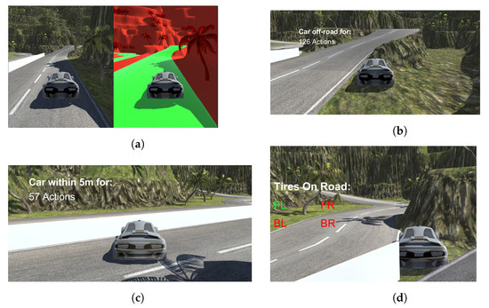 Figure 3 shows the segmentation photos, the tires which are off the road and the number of times any of them have been off the road, as well as the number of times the vehicle has been in the area. Figure 3a shows the comparison between the RGB and the segmented image while Figure 3b shows the number of actions where the vehicle had any of its tires off the road. The number of actions during which the vehicle was within 5 m is shown in Figure 3c. Figure 3d shows which of the tires are on the road, with the green letters representing tires on the road, and red representing tires off the road. The letters FL refer to the front left tire, while the letters BR represent the back right tires.