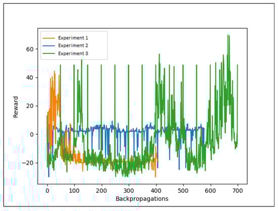 Figure 4 shows the number of backpropagations for experiments 1, 2, and 3 and the respective rewards for each backpropagation. In this figure, an increase in reward indicates that the experiment has learned the actions correctly.