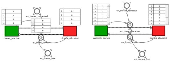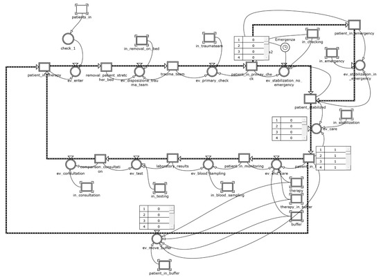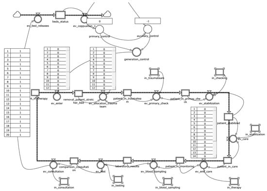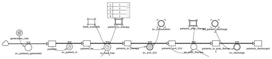 The level variables patients_in and patients_in_post_therapy constitute the blocks that process patient operations as a result of a circular programming activity. These variables have been linked with the chain of events—the module that defines how all the states vary within the model. These structures have the duty of scanning the sequence of operations performed by physicians and nurses in the ward until the moment of discharge. The model adopts an array logic: each patient care cycle follows a scheduled pathway in which each next step can be activated only if the resources (bed, medical, nurse, equipment) are available (Figure 2).