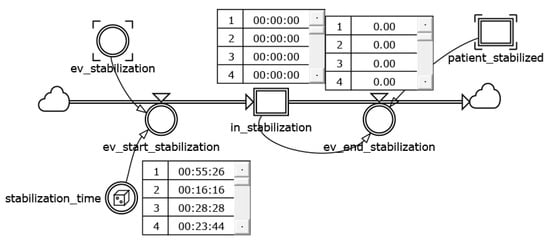 This module reproduces the timing of any intensive care procedure, and also allows for the triggering of state evolution, not only when resources become available, but also in the event that the time associated with the activities runs out. For example, the timing of patient stabilization is triggered by the ev_stabilization flow variable (Figure 4).