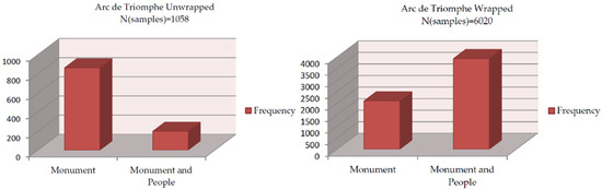 Before moving on to our examination, we should point out that this research question is common to all datasets of the Arc de Triomphe, both unwrapped and wrapped. According to the sentiment analysis and annotation processing, three emotions emerged that stimulated users to comment and share posts of the Arc de Triomphe monument before and after the installation art. These emotions were triumph, attraction, and surprise [107,108] for all of the datasets with N samples (see Table 4) per dataset. For both Unwrapped datasets, the attraction value is the class with the largest number of samples. Contrary to both Wrapped datasets, the surprise value was the class with the largest number of samples. The sentiment of surprise getting over the other classes indicates that the viewers were astonished by the Arc de Triomphe Wrapped Installation art and wanted to share their aesthetic experience on social media. The aim was to classify the four features related to sentiment.