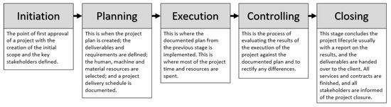 The construction industry can be defined as the construction, extension, installation, repair and maintenance, renewal, removal, alteration, dismantling or demolition of any building or structure, transport infrastructures, power, and water services [25]. This covers both commercial and industrial applications, residential buildings, as well as infrastructure items, such as transport routes, water service stations, and the connecting pipelines. Over this wide field of construction, projects can be categorized into five stages. These stages are initiation, planning, execution, controlling, and closing [26]. A flowchart explaining each stage of the project lifecycle is given in Figure 2.