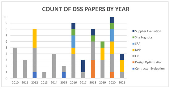 The areas in which a DSS may be applied in the construction project lifecycle varies in the forms of data being used, the tasks of the inference system, and when in the cycle these tools may be applied. The 68 papers listed in this study have been organized into six distinct categories based on the task of the DSS. There is early-stage project prediction (EPP), which takes up 50% of all studies, with sub-categories focusing on various metrics for performance measurement; there is dynamic performance prediction (DPP), which takes up 17% of all studies; and then, there are papers focused on contractor and supplier evaluation, site logistics, design optimization, and safety risk assessments (SRA). Looking at Figure 4, there has been an increase in studies over the second half of the last decade, which would suggest an increase in interest in this field. It can also be noticed that the EPP has a near-consistent level of interest throughout the decade with other areas such as SRA, site logistics, DPP, design optimization, and supplier evaluation having more studies from 2016 onward. This shows a growth in the quantity of studies over this period but also a growth through increased variety of application.