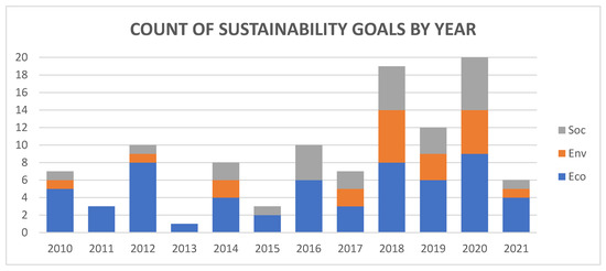 FL has been used for all categories of DSS except design. This is a useful tool when the data are based off experts’ opinions [31,47,48,79]. With the nature of construction projects relying heavily on the experience of personnel [2,3], it makes sense that one of the most widely used AI models is FL, as it is useful for quantifying linguistic data. As can be seen in Table 2, the goal of sustainability, which has accumulated the most interest, is the economic goal of sustainability, with 87% of all studies focused on this. Figure 5 shows a near-consistent number of research papers over the last 10 years, which all focus on the economic goal of sustainability. The environmental and social goals of sustainability were considered in 30% and 38% of all papers, respectively. Figure 5 shows a trend of increased interest in the environmental and social goals over the latter half of the decade, expressing an increase in interest for project sustainability. This agrees with [5], as there has been a push to focus on multiple sustainability factors from the start of this century, while economic results have always been a key consideration in project management.