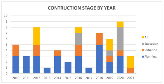 Each of the papers were evaluated for the stage of project in which the operations of the decision tools were focused. The stages, as stated in Table 2, are initiation (init.), planning (plan.), execution (exec.), controls (cont.), and close. There are also studies that focus on the whole project lifecycle rather than any single stage. No study was recorded as solely operating in the controls or closing stages. Nearly half of all papers, 43% studied, were focused on decision support in the planning section, and a further 18% were focused on the initiation stage of construction. It can also be seen in Figure 6 that there has been a consistent production of publications focused on the planning and initiation stages of the project lifecycle. Research focused on the execution stage of the lifecycle has gained attention from 2016 onwards. The same trend is seen with studies that cover all five stages of the lifecycle although there was a spike of four papers in 2012 that covered all stages.