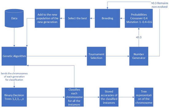 Information system diagrams are used to properly define the role and the design of the first level of this application. These information system diagrams describe how information is moving across the functions, indicating the procedures that contribute to the development. More specifically, in the current work, the use of flowcharts and sequence diagrams is considered essential for introducing the model to the reader. The flowchart, the abstract dataflow diagram, and the sequence diagram describe the backstage processes. The flowchart is a diagram that can show the basic functions of the entire project. It consists of the basic processes, the functions, and the messages that are sent among the different parts of the project. It explains how the genetic algorithm works and how the binary decision trees are associated with the genetic algorithm. The wrapping method is a part of the implementation, and it cannot be demonstrated separately from the entire application (Figure 2) [20]. The genetic algorithm reads the attributes of the dataset and starts to randomly create the population of chromosomes of the first generation. Some of the chromosomes may have the same attributes as genes more than one time. In order to create the rest of the generations, the tournament selection method, the mutation, the crossover, and the selection of the best method are used (Figure 3) [20,21].