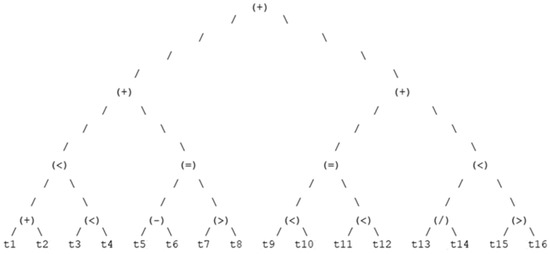 The first plan for the decision tree algorithm was to build the application according to the original decision tree theory which includes the information gain and Shannon function mathematic formulas. Instead of using the standard decision tree algorithm, another decision tree is used, known as the binary decision tree or the ensemble full binary decision trees. A full binary decision tree is a symmetric, fully deployed tree with all of its nodes reaching the terminals. The tree has a depth of 4. There is a variable in the code declared as maximum decision trees (max_dt) and it defines the number of DTs that are constructed and participate in the classification process. The sizes of the trees are fixed, and the user can change the number. Suppose the max_dt is 10—this means that 10 decision trees are created and all of them contribute to the classification (Figure 3) [21,22].