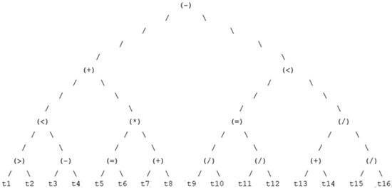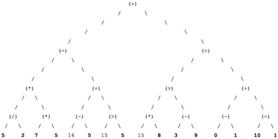 This method basically finds the attributes that participate the most in the classification process using a GA wrapper. It provides a novel approach to read, process, optimise, classify, and analyse data from a dataset. Feature selection methods are intended to reduce the number of input variables for those that are believed to be most useful to a model to predict the target variable. The two interconnected algorithms refer to a basic optimisation algorithm, the GA, and a basic classification non pruned algorithm, the binary DT (BDT). Both algorithms are wrapped together in a way that can be considered parallel data processing. The wrapping method can also be defined as the constant communicator between the GA and the DT algorithms. When a dataset is big, the classified data will be represented in a huge tree form. This tree is difficult to read and overfitting most probably occurs. To decrease the probability of this happening, the use of a GA is vital [15]. The logic behind the GA wrapper is on the grounds of selecting features from a dataset and sending them to the DTs for classification and tree representation each time. The GA is responsible for collecting and selecting the best subsets of features, which will perform equally as the initial number of features. Each time a subset of features arrives at the DTs, it is classified and assigned with a classification accuracy number, also called fitness, which denotes how effective the GA is in generating subsets [16]. This procedure is constantly repeated, and after a certain number of repetitions, the GA will return to the DT algorithm a combination of attributes that is represented as a tree structure. The wrapping method handles the entire communication between the DT and the GA and makes it seem like they are being executed simultaneously. By using this wrapping method and processing the data in parallel through the DT and the GA, overfitting is avoided. Moreover, a record can be generated of the best combination and the progress that has been achieved, and the classification of the data can be more easily represented. The best subset of attributes or genes is finally demonstrated through tree form representations, indicating the classification accuracy for training, validation, and testing sets of data [17,18].