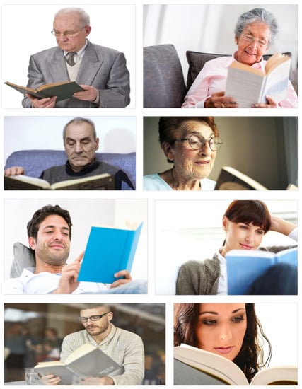 Each questionnaire shows one picture of a person reading a book, followed by eleven questions: eight of which were closed and three were open-ended (see Appendix A). The questions were to be answered based on the image-the questions were the same for all pictures. The first nine questions relating to stereotypes and all of the pictures are the same as in the previous questionnaire [25]. Both of the new questions were related to design. The questions from the original questionnaire were translated into German by a coauthor with professional translation experience. The result was then compared to the original by another person, and piloted to check if the results roughly match expectations.