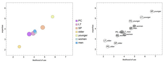 Figure 2 shows the plane of responses to the variables likelihood of use and expertise with the most important groups located at the points with coordinates corresponding to mean ratings of the group. One can observe that the differences concerning age are much greater than the differences concerning gender. Note that, compared to age, the devices are also quite close. It can also be seen that the inferred expertise is lower for women than for men, with the exception of the smartphone where women are ahead.