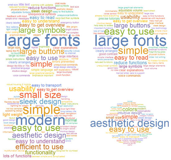 The next phase was to develop overarching themes from the codes and review these. To provide more context for this, in addition to the code itself, the other data was examined, including all of the original answers for the design aspects, the answer to the question about whether the technology should be adapted, whether they thought the person depicted was old, as well as, the gender and age category of the person depicted. Due to the goal of the study, the analysis was split into four categories based on the people depicted, called user categories in the paper: older men, older women, younger men and younger women. Braun & Clark suggest using visual representations to help this process [68] (p. 19). For this, word clouds were generated from the codes using Wolfram Mathematica, which display the size of the codes based on the number of times it occurs. With this type of data, the number of times the individual codes occur corresponds to extensiveness, i.e., how many different participants mentioned it [87] (p. 147). For the word clouds, no differentiation was made which slot the answers came from. The word clouds were also deemed to be a good way to visualize the coded answers for the paper. Before writing the paper, the themes identified were refined and re-named.