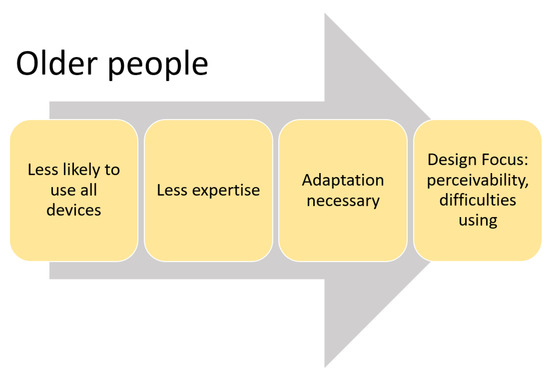 In the media, there is much discussion about increasing digitization. It has paved ways for many new technologies and more data complexities but it has also led to an ever-growing number of users that had previously been excluded from digital participation. At the same time, it appears that entrenched stereotypes about groups that tend not to use technological devices on a regular and proficient basis are hard to discard. This is complicated by the fact that older people may reject “gerontechnologies”, technical devices specifically aimed at older people, as they feel they are stigmatizing [23,24].
