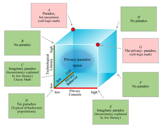 To explain the privacy-paradox space, we identify the vertices of the cube: (A) High privacy behavior but low privacy concern and high literacy. This situation is paradoxical (because the high literacy should lineup with the behavior and the concern), but is uncommon and do not represent the classic privacy paradox; (B) Low privacy behavior and low privacy concern, with high literacy. There is no paradox regardless of the literacy level; (C) High privacy behavior but low privacy concern and low literacy. This situation is not paradoxical, or introduces an imaginary paradox (because low literacy explains the deviation); (D) Low privacy behavior and low privacy concern, with low literacy. There is no paradox regardless of the literacy level; (E) Low privacy behavior but high privacy concern and low literacy. This situation is not paradoxical, or introduces an imaginary paradox (because low literacy explains the deviation); (F) High privacy behavior and high privacy concern, with low literacy. There is no paradox regardless of the literacy level; (G) Low privacy behavior, high privacy concern and high literacy. This is the classic privacy paradox in which privacy behavior deviates downward from privacy concern despite a high literacy level. Therefore, the deviation cannot be explained; (H) High privacy behavior and high privacy concern, with high literacy. There is no paradox regardless of the literacy level. The privacy paradox of an individual is expressed in the privacy-paradox space. Soft logic math is beneficial in the two ranges that introduce a true paradox (the spaces that are close to either point A and/or point G). These ranges are described in psychology by the “double bind theory” [81]. A collection of individuals forms a distribution which is the privacy-paradox sphere.