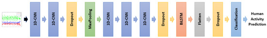 The rest of the paper is organized as follows. Section 2 provides a review of the existing works in the human activity recognition field. A detailed description of the proposed 1D-CNN-BiLSTM model is presented in Section 3. The datasets used in the experiments are described in Section 4. Section 5 provides the hyperparameter tuning results for the optimal model settings. The experimental results and confusion matrices are analyzed in Section 6. Finally, the conclusions are drawn in Section 7.