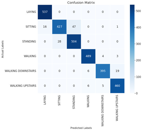 The confusion matrix of the 1D-CNN-BiLSTM model on the UCI-HAR dataset.