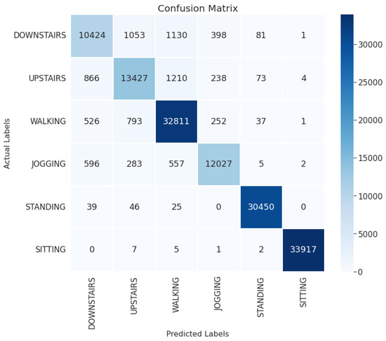 The confusion matrix of the proposed 1D-CNN-BiLSTM model on the UCI-HAR dataset is depicted in Figure 2. Note that the sitting class is often mistakenly recognized for the standing and laying classes due to these activity classes being static, hence producing similar sensor time series. Apart from that, the walking downstairs, walking upstairs, and walking classes are also frequently misclassified to each other as they involve relatively identical limb movements.