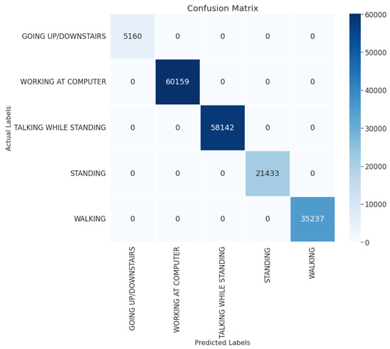 On the Single Accelerometer dataset, all testing samples are correctly classified as displayed in Figure 4. The activity classes of this dataset are comparatively well separated, where the highly confounding classes, such as walking upstairs and walking downstairs are grouped into one activity class. The discriminative capability of the 1D-CNN-BiLSTM model and the inter-class disparities in the accelerometer sensor data collectively contribute to the spectacular performance on the dataset.