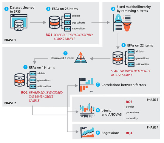 The statistical analyses were conducted in four phases using the steps illustrated in Figure 1. First, to evaluate RQ1 (Research Question 1), we reproduced the explanatory factor analysis (EFA) on the full data set using the same parameters and approaches reported by Choi, Glassman, and Cristol [1]. The second phase of our analysis was focused on RQ2. Correlation results were reviewed, items were reassessed, and cross-national and cross-generational EFAs were run. From there, descriptive and comparative statistics were computed on the revised scale to assess RQ3, the effect of interactions between gender, nationality, and generation on the different scale scores. Lastly, in order to assess RQ4, regression and linear modeling were used to better understand the interaction effects of the different scale items.