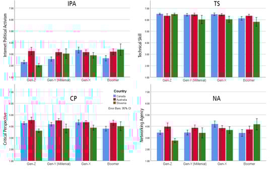 Thus, through the IPA factor, the DCS-R does tell us something interesting about digital citizenship. As revealed in this study, technical skills, gender, and nationality appear to play a very minimal role in predicting a participant’s IPA. Generation played a more statistically significant (albeit small) role in that older respondents were more likely than younger ones to use the Internet for political actions (though in a recent examination of digital vs. non-digital activism, [33] found the opposite interaction). Interestingly, our pre-COVID-19, late 2018 data showed that technical skills and networking agency were statistically equivalent between older and younger generational cohorts. While this might mean the relationship between age and technical skills is no longer salient, it might also simply reflect sampling bias (an online survey is going to attract those already comfortable with the Internet) or a lack of discernment in the TS questions in the DCS. Regardless, what was different in the older groups was not technical know-how or networking usage but an interest in politics and a willingness to use that interest for political/social engagement.