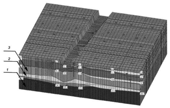Thus, the layers will take the form shown in Figure 1 [2]. The figure shows that the model of Kislovodsk mineral water field formations indicates: 1—common narzan; 2—dolomite; 3—sulfate.