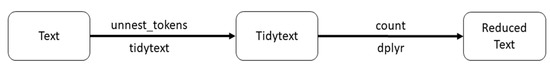 - Silge, J.; Robinson, D. tidytext: Text Mining and Analysis Using Tidy Data Principles in R. J. Open Source Softw. 2016, 1, 37. [Google Scholar] [CrossRef] [Green Version]
