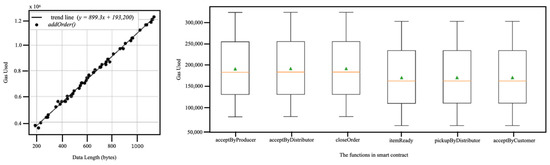 Figure 4 shows the relationship between data length and gas used in the addOrder() function. This trend line shows that the gas used is the direct variant, with the data length as a linear function. The trend line is y = 899.3x + 193,200 where x is the data length, y is the gas used, and R2 = 0.9940.