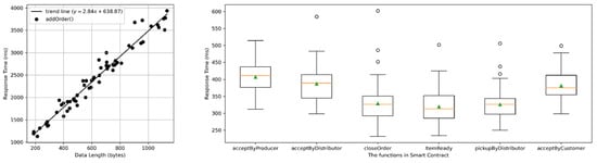 For the functions in the setStatusAndTimeStamp() group, the response times are clearly different. There is no significant correlation between the data length and response time. The main statements are updating the timestamp and the status. Thus, each function’s hash time and block time are not different. On the other hand, the operation and data transmission between processes cause latency and result in the transaction’s overall response time not being predicted correctly.