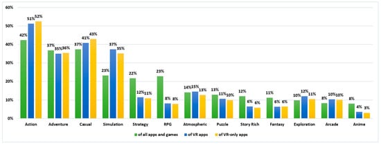 This stage of the research included gathering, analyzing, and presenting data on applications and games available on the Steam platform. Data were collected from the Steam website [35] by searching and browsing the website and using the search engine. Table 1 summarizes the results of the search in numbers and of the analysis of those data in percentage terms. It includes genres in which there were more than 10,000 total games and applications (state on 6 July 2022). It also shows the number of VR applications in the given genre—they were searched with the “VR” tag. It is worth noting that there are many games available that are at the same time VR and non-VR. This means that they were usually non-VR games first, but the VR version became available too. The example of such a game is “Keep Talking and Nobody Explodes”. It is possible to play it via PC but also using some of the popular headsets, such as HTC Vive, Oculus Rift, etc. However, there are many games that were created exclusively for Virtual Reality. They have been tagged as “VR-only”.