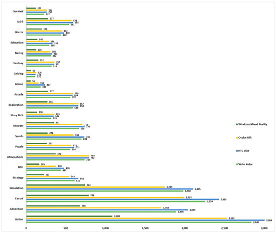 In the next stage of the research, it was decided to study the genres of applications for a given headset. Figure 3 shows the number of VR applications for a given headset based on the genre. Data was obtained from the Steam library. Figure presents genres in which there were more than 100 applications for at least three out of four headsets. It has to be mentioned that some applications can be found in more than one genre, as well as used by more than one headset. The biggest number of VR applications are action apps available for HTC Vive; there are 30,004 of them. More than 2000 apps are dedicated to play also on HTC Vive in the following genres: casual, simulation, and adventure. In the reference to Valve Index, the most numerous are action and casual apps. More than 2000 apps for Oculus Rift are only in one genre—action. Action apps are the biggest group also for Windows Mixed Reality; however, there are almost three times less than in the case of HTC Vive apps. There are many car-related apps—they are tagged as “driving” and “racing”. Education-related apps can also be found on Steam—they are tagged as “education”. There are quite a lot of “anime” apps. For players that like to exercise their brains, strategy and puzzle apps will be matched and will meet users’ expectations. By analyzing the types and numbers of games, it can be concluded that there are so many of them that they reach a wide group of recipients, and the preferences of players are quite different.