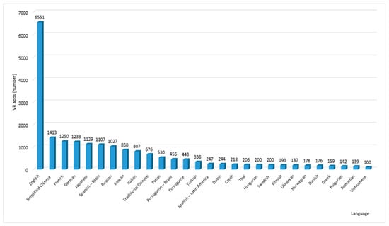 The number of VR applications in each language (languages with at least 100 apps) on Steam [author’s own study based on data from [35] [state on 6 July 2022].