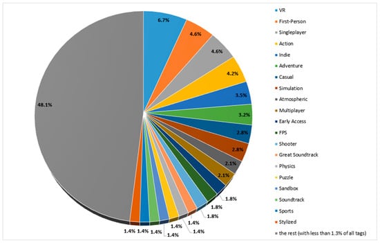 Subsequently, the author decided to analyze every tag in relation to all tags. Therefore, the author determined the count of each tag appearing among all 283 tags. Figure 6 presents the pie chart with the data on the individual tags. The tags whose share was equal to or greater than 1.3% of all tags were presented on the chart individually, but the rest of them are included in the gray area—the biggest pie slice. The most numerous tag (‘VR’) occurred in 6.7% of all tags in total. “First-person” and “singleplayer” tags accounted for 4.6%. The rest of the results are presented in Figure 6.