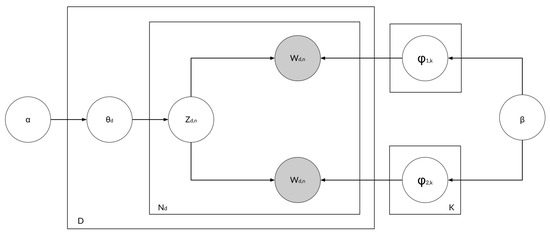 Natural Language Processing (NLP) has played an important role in human–computer interaction and artificial intelligence. It is often implemented in the domain of language structure analysis, technology-based machine translation, and language recognition [11]. Several unsupervised methods have been proposed to identify and model topics within textual documents. One of the most popular methods for topic modeling is Latent Dirichlet Allocation (LDA) [12,13]. The basic idea of the LDA method is that each document is represented as a random mixture of hidden topics, where each topic is characterized based on the distribution of words that lie within the topic itself. The LDA model generates a distribution of topics for the documents that can be immediately used as features for classification. The combination of topic and word frequency information may result in an enhanced set of features and in turn increase the performance of text classifiers [14]. Schröder [15] developed an LDA-based document classification method for accurate topic-based tagging of scientific articles. The proposed method is called CascadeLDA. It was indicated in the study that CascadeLDA required significantly fewer iterations compared to another extension of LDA, namely Labeled LDA (L-LDA), but it relies heavily on the label structure and general characteristics of the dataset. In the studies conducted by Suri and Roy [16] and Chen et al. [13], the LDA method was compared to Negative Matrix Factorization (NMF) for data detection with a large text flow. It was shown that the semantic results produced by LDA were more meaningful than the NMF method.