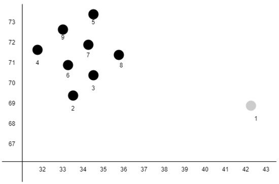 ABOD is a method to detect outliers. ABOD assigns an Angle-Based Outlier Factor (ABOF) to each point in the database and returns a list of points that had been sorted based on the ABOF of the points [17]. Figure 5 illustrates the ranking of each points within a dataset. The top-ranking point (number 1) is the farthest outlier. The subsequent ranks are determined by the next farthest cluster boundary point. Since distance is only taken into account as a weight for the variance of angles, ABOD can succinctly detect outliers even in high-dimensional data.
