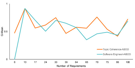 Although the results of evaluation scenario 2 indicate that the combination of ABOD and topic coherence exhibits better performance in terms of F1-score and G-mean than the other combinations, the use of human judgment as the estimation approach to determine the optimal number of topics and iterations combined with ABOD also exhibits considerably good performance. The results of evaluation scenario 3 support this statement. We can see in Figure 8 that the combination of software engineer and ABOD exhibits a close pattern of G-mean scores compared to the combination of topic coherence and ABOD.