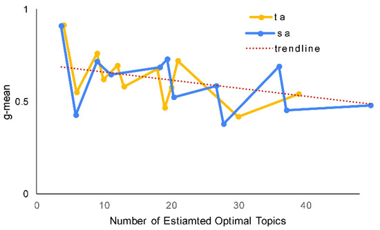 Tang et al. [40] suggested that the number of topics may affect the efficacy of LDA in mapping the topics against documents. Figure 9 shows that MultiPhiLDA also supports this claim. Figure 9 represents the two-dimensional plotting between the topic ratio (the number of predicted optimal topics divided by the number of requirements within an SRS document) and the G-mean score. The trendline indicates that with more topics, the G-mean scores obtained by the proposed framework are lower. This phenomenon can be explained as follows. An SRS of a project that covers a wider problem domain may have more topics compared to one that covers a narrower problem domain. For instance, an enterprise resource planning (ERP) system covers a wider domain than a supply chain management (SCM) system. Therefore, the ERP system should have more topics than the SCM system. Another example is between an employee attendance (EA) system and a human resource development (HRD) system, where an EA system covers a narrower domain than an HRD system. Therefore, an EA system should have less topics than an HRD system. An HRD system may have subsystems that cover a broad range of topics related to attendance (clock in, clock out, schedule, paid leave, and overtime), career (role, grade, skills, retire), training (short-term, long-term, hardskill, softskill, and registration ), payroll (salary, bonus, gross pay, work hours, exempt employee, pension, insurance, tax, and allowance), recruitment (part-time, full-time, employee, contract, and application), and performance (target, realization, indicators, evaluation, planning, and monitoring). A topic within a subdomain should be relevant to the other topics in that particular subdomain. For instance, the clock-in topic is relevant to the other topics within the attendance system, such as clock-out, paid leave, and overtime. On the other hand, topics of different subdomains, for example clock-in and insurance, are usually irrelevant to each other. However, there may be an instance where a topic may be relevant to other topics in other subdomains. For example, the salary topic, which is part of the payroll system, may be relevant to topics in the attendance system such as paid leave and overtime. This is because both subdomains are part of a bigger domain.