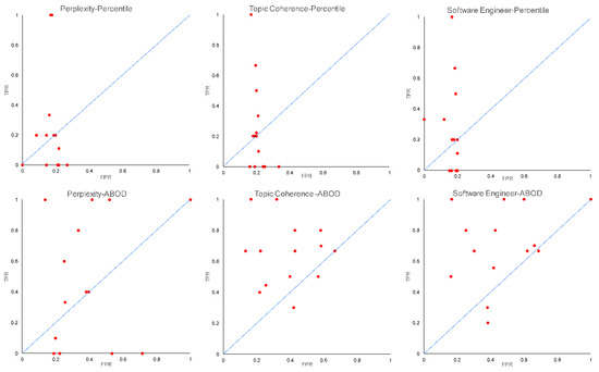 In order to further analyze the diagnostic ability of our proposed framework in detecting irrelevant requirements, we also conducted receiver operating characteristic (ROC) analysis on the six models of different combinations. Figure 10 shows the ROC curves of each model that has a different combination of estimation approaches and outlier detection methods. The curve is a plot between the true positive rate (TPR) and false positive rate (FPR) obtained by the model on each SRS document. A good classifier is indicated by a larger number of dots on the upper side of the diagonal line, while a bad classifier is indicated by a larger number of dots on the lower side of the diagonal line. From the six ROC curves, we can visually analyze that the combination of ABOD and topic coherence produced a higher number of dots on the upper side of the diagonal line compared to the other combinations. This indicates that the combination of ABOD and topic coherence results in a a better noise classifier to detect irrelevant requirements within SRS documents. The three dots that lie on the lower side of the diagonal line are associated to the DA-03, DA-04, and DA-11 SRS documents, in which the ratio between the estimated number of topics and the number of requirements is relatively higher than that of the other SRS documents.