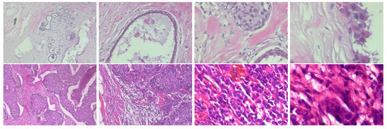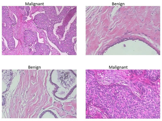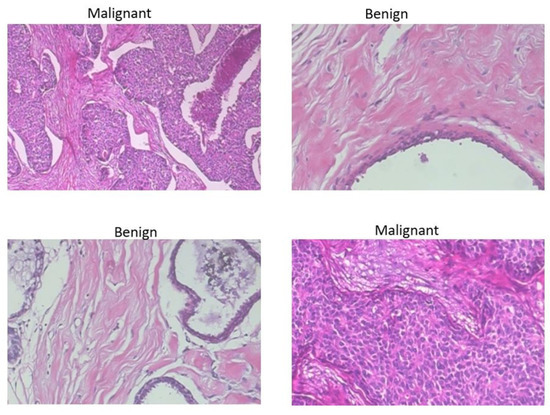 Computer-assisted diagnosis systems (CAD) for breast cancer detection have been proposed to automate recognizing cancerous regions, for distinguishing normal vs. abnormal tissues (tumors), and malignant vs benign tumors, increasing accuracy by up to 10% [5]. CAD systems are fast, readily accessible, and dependable for early diagnoses [6]. In most contemporary CAD frameworks, machine learning is adopted for medical image analysis, breast cancer detection, and diagnosis [3]. Automated therapeutic imaging techniques including breast X-ray images, sonograms methods, magnetic resonance imaging, computed tomography, and histopathological imaging are compelling for breast cancer detection [7,8], as the accuracy of manual breast cancer screening varies depending on the pathologist’s experience and knowledge. Human errors can occur, resulting in incorrect diagnoses. Histopathological images are currently considered the highest quality for the clinical identification of cancer [9]. Automated and exact classification of histopathological images is the foundation of many top-down and bottom-up image analyses such as nuclei classification, mitosis detection, and gland segmentation [10]. However, of all histopathological image examination tasks, tumor classification is the most important. Earlier image-based breast cancer classification research utilized machine learning (ML) with handcrafted image features [11,12,13,14]. However, due to their impressive performance in computer vision and image processing tasks, approaches utilizing neural networks have recently become popular. Convolutional neural networks (CNNs) have demonstrated superior performance for a wide range of image analyses tasks, including image classification, ailment detection, localization, segmentation [15], and the analyses of histopathological images [16].