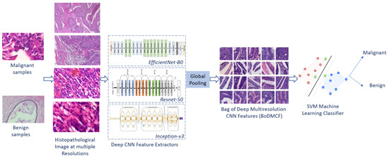 Our overall approach involves extracting deep multi-resolution features from four resolutions (40×, 100×, 200× and 400×) of high resolution (2048 × 1536) histopathological breast cancer images using the Efficientnet-b0 [17], Inception-v3) [18], and ResNet50 [19] pre-trained image pre-trained CNN models that are pooled using global pooling to create a BoDMCF. A support vector machine (SVM) classifier then uses the BoDMCF to classify histopathological breast cancer images as either malignant or benign. As shown in Figure 6, the proposed framework of breast cancer classification consists of three main modules: (i) data pre-processing, (ii) deep BoDMCF feature extraction, and (iii) classification using SVM.