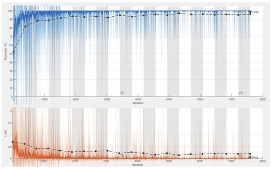 where is the moving average of squared gradients, is the gradient of the cost function with respect to the weight, is the learning rate, and is the moving average parameter. The classification layers utilized label smoothing regularization (LSR). LSR can be obtained by replacing a single cross entropy in the loss function with a pair of losses in the cross entropy, and , as given in Equation (8) below. The second loss penalizes the deviation of predicted label distribution p from the prior u, with the relative weight . is a measure of how dissimilar the predicted distribution p is to uniform.