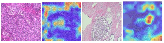 where is the class-discriminative localization map. Grad-cam was applied to produce a coarse localized map highlighting the most important ROIs in the histopathological images to classify the images as benign or malignant. Sample grad-cam results are shown in Figure 14.