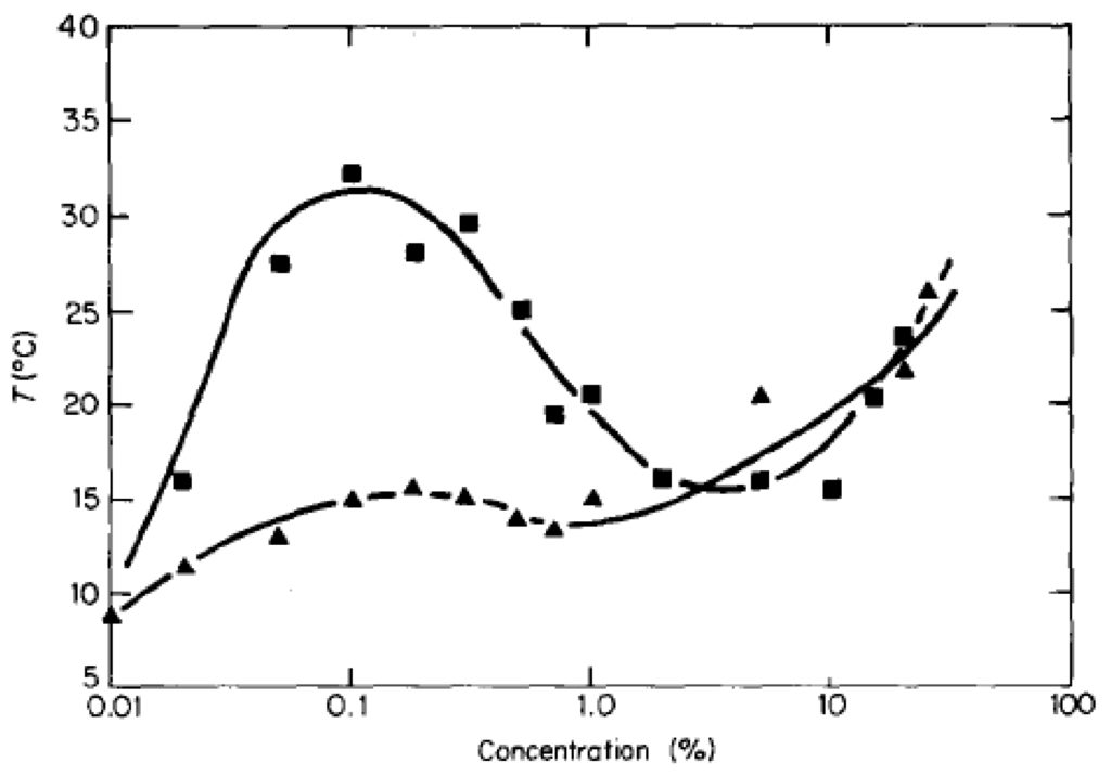 Effect of polymer concentration and salt on polySPE phase behavior with respect to temperature. Polymer Mw = 4.35 × 105; ■, Water; ▲, 0.3% Aqueous NaCl (0.51 M) [17].