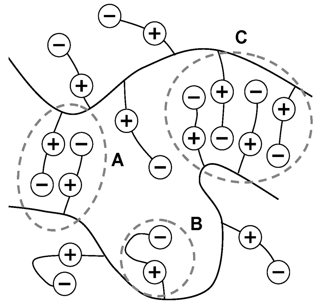 Short zwitterionic cluster (A), intragroup ion pair (B), long zwitterionic cluster (C), nucleated from a short cluster with entropy driven propagation outwards. Figure adopted from [28].