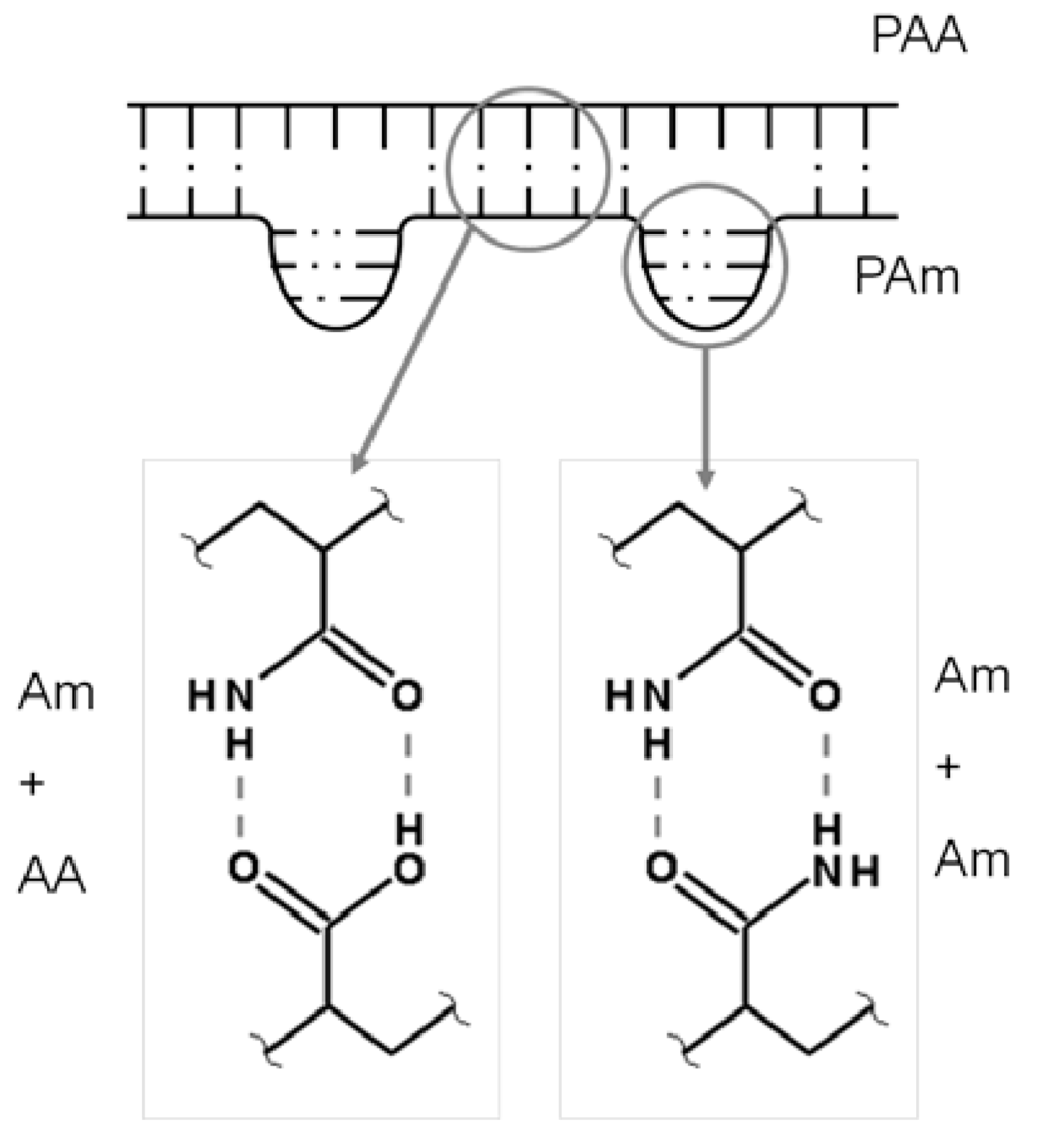 Competing hydrogen bond complexations in PAm and PAA hydrogels. Adapted from [36].