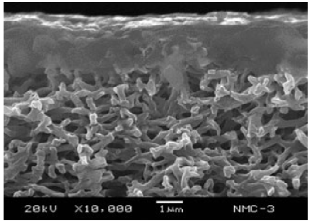 Scanning electron microscope image of nylon-6 membrane after sequential polymerization of a Am-AA IPN [76].