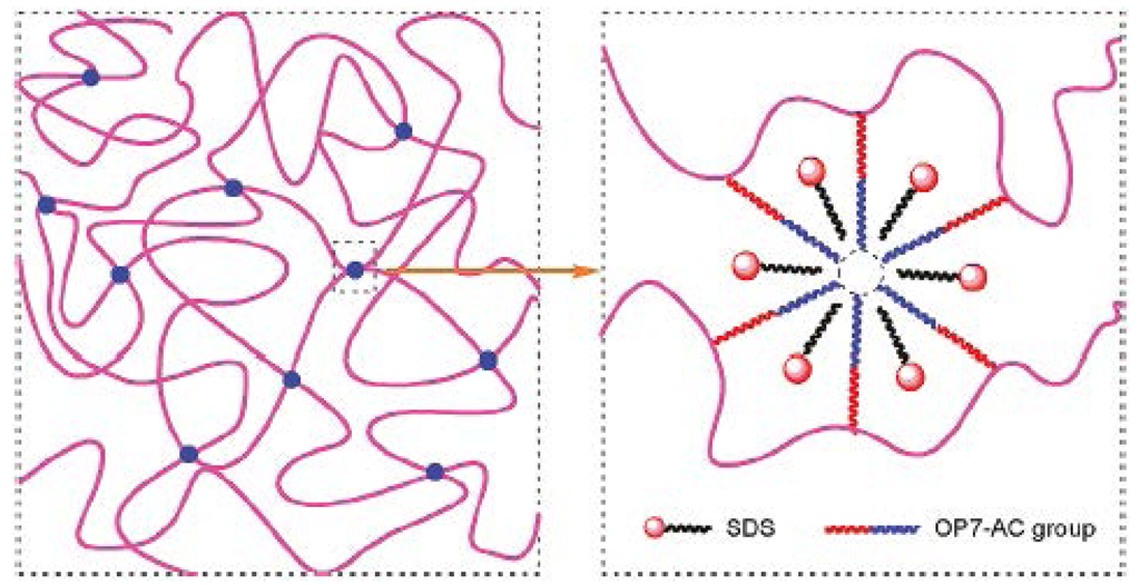 The work using octylphenyl polyoxyethylene ether (OP7-AC) as the hydrophobic monomer was interesting as a crosslinking agent was not used [68]. First, it should be noted that the monomer needed to be modified by adding an acryloyl chloride group in order for it to be polymerized into the Am chain. The hydrogel synthesized incorporating OP7-AC was crosslinked by interconnecting micelles of the OP7-AC pendant chains stabilized by sodium dodecyl sulfate (SDS) (Figure 8). These micelles acted as the physical crosslinks.