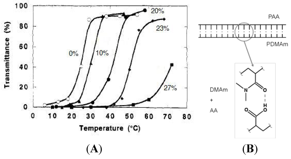 The suppression of amide-amide interactions is one of the effects of incorporating a hydrophobic co-monomer into the hydrogel network. However copolymerization of the hydrophobic monomer doesn’t always lead to more efficient hydrogen bonding between the amide and carboxyl groups as was seen with OP7-AC which had its own competing hydrogen bonding. There is another way to include hydrophobic functional groups which disrupt the dipole interactions between amide groups but do not hydrogen bond or create a steric hindrance which disables volume-phase transition. Substituting alkyl groups on the nitrogen of the amide introduces a hydrophobic property without another monomer. There is a balance however between the size of the substituted alkyl group and the strength of the amide-carboxyl hydrogen bond. NIPAm is one such N-substituted Am where the isopropyl group fully disrupts the interchain hydrogen bonding and hydrophobic interactions become dominant, promoting thermophobic behavior. N,N'-dimethylacryamide (DMAm) is a N-substituted Am that has been used with AA in IPN hydrogels to improve the amide-carboxyl group hydrogen bonding efficiency [36]. Like other IPNs, the DMAm monomer is copolymerized with Am to form the initial gel for a sequential IPN synthesis. MBAm and AP are used, respectively, as the crosslinking agent and initiator. Concentrations of DMAm used in the synthesis of the initial poly(DMAm-co-Am) gel varied between 0 mol% and 27 mol%. Similar to the other hydrogels incorporating a hydrophobic co-monomer, increasing DMAm content in the composition of poly(DMAm-co-Am)/PAA IPNs caused the VPTT to rise. This was confirmed by UV-transmittance, the VPTT rose from 25 °C at 0 mol% DMAm to 40 °C at 20 mol% (Figure 9A).