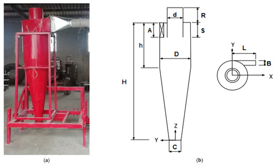 (a) Schematic of used cyclone in experiments, (b) dimensions of cyclone.